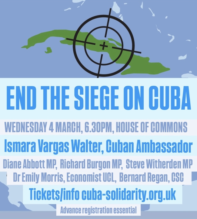 As the United States intensifies economic warfare against Cuba, the humanitarian consequences are deepening. This important parliamentary meeting will hear from the Cuban Ambassador on how sanctions are exacerbating shortages of fuel, food and essential medicines. Dr Emily Morris, recently returned from Cuba, will provide first-hand economic analysis and an account of conditions on the ground. And MPs and campaigners will examine what Britain can and must do to uphold international law and oppose unilateral coercive measures.