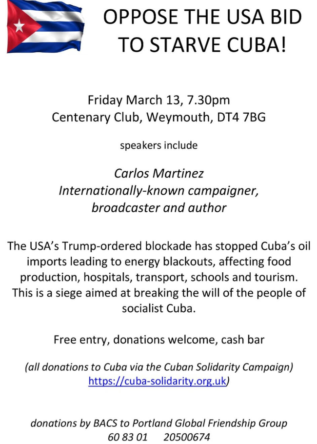 Oppose the USA bid to starve Cuba! - Weymouth meeting