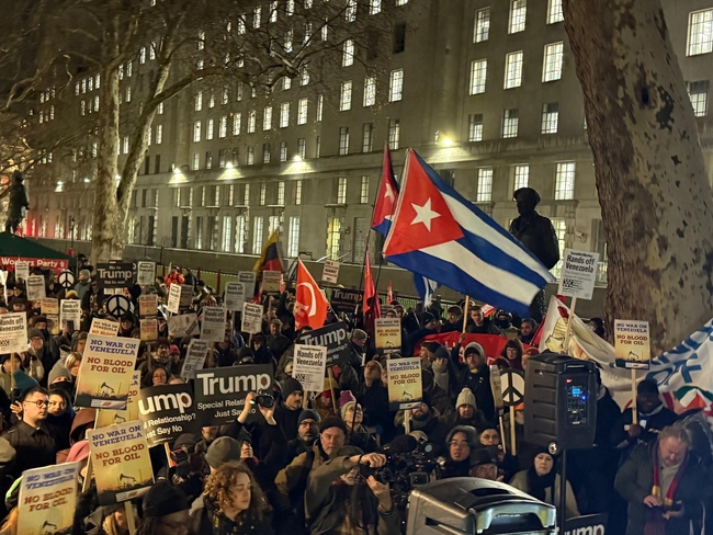 The Cuba Solidarity Campaign (CSC) and its supporters joined nearly 2,000 others gathered outside Downing Street in London on Monday evening to protest against the US attack on Venezuela, the kidnapping of President Nicolas Maduro and his wife Cilia Flores and wider US aggression against Latin America.