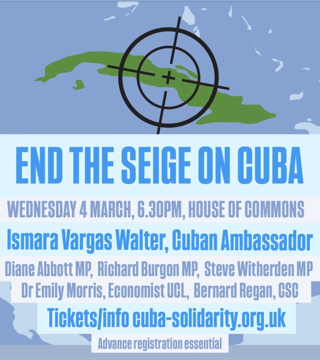 As the United States intensifies economic warfare against Cuba, the humanitarian consequences are deepening. This important parliamentary meeting will hear from the Cuban Ambassador on how sanctions are exacerbating shortages of fuel, food and essential medicines. Dr Emily Morris, recently returned from Cuba, will provide first-hand economic analysis and an account of conditions on the ground. And MPs and campaigners will examine what Britain can and must do to uphold international law and oppose unilateral coercive measures.